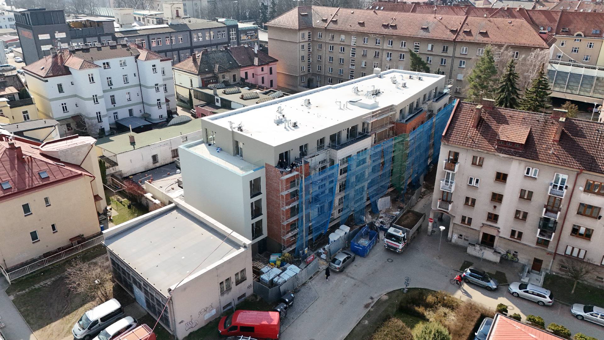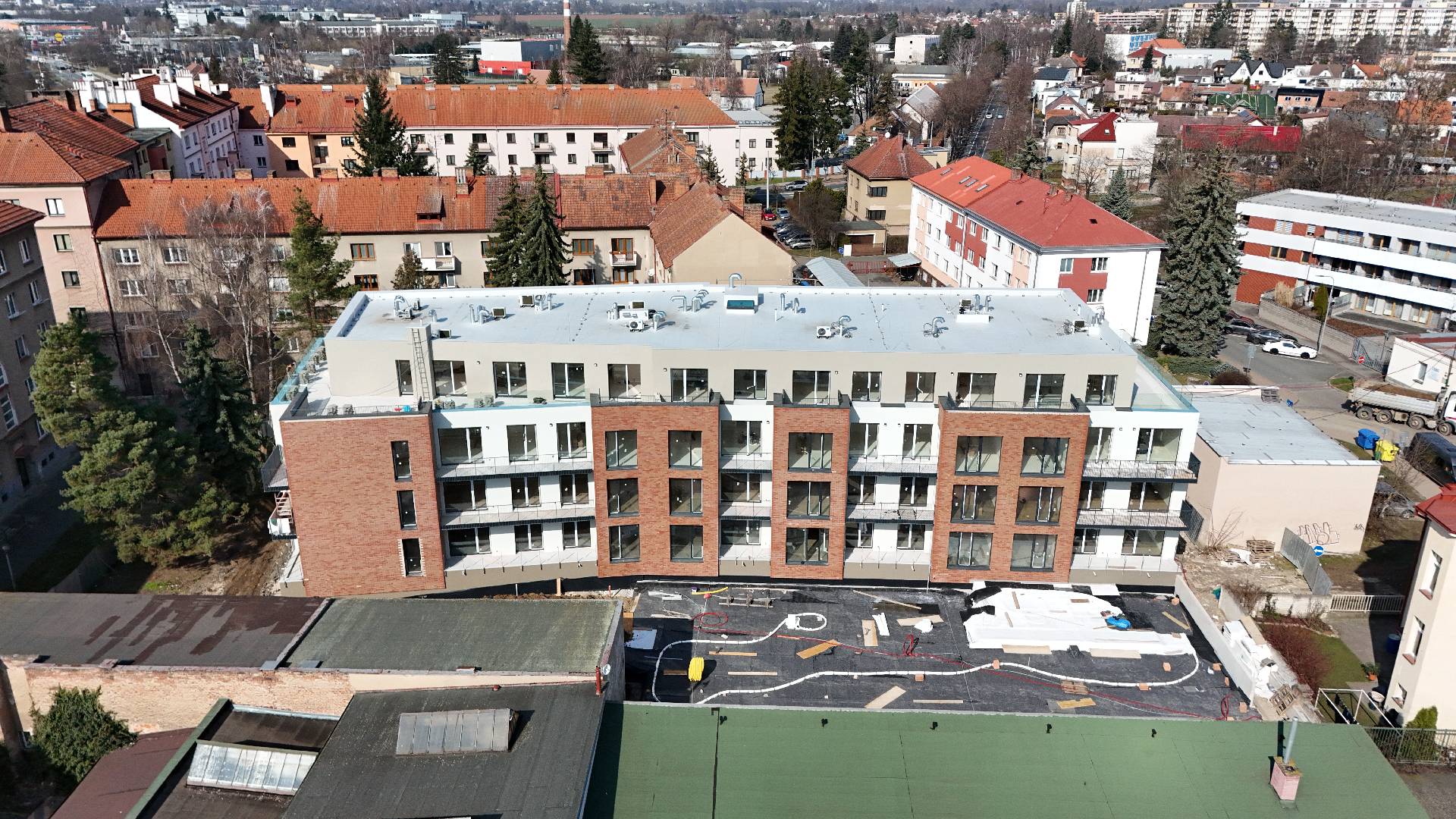 Výstavba projektu se posouvá do závěrečné fáze. Obklady a dlažby jsou hotové až do 5. nadzemního podlaží, vinylové podlahy a malby jsou dokončeny do 4. NP. Od pondělí začalo osazování veškerých interiérových dveří. Dokončeny jsou také garáže a instalováno skleněné zábradlí.