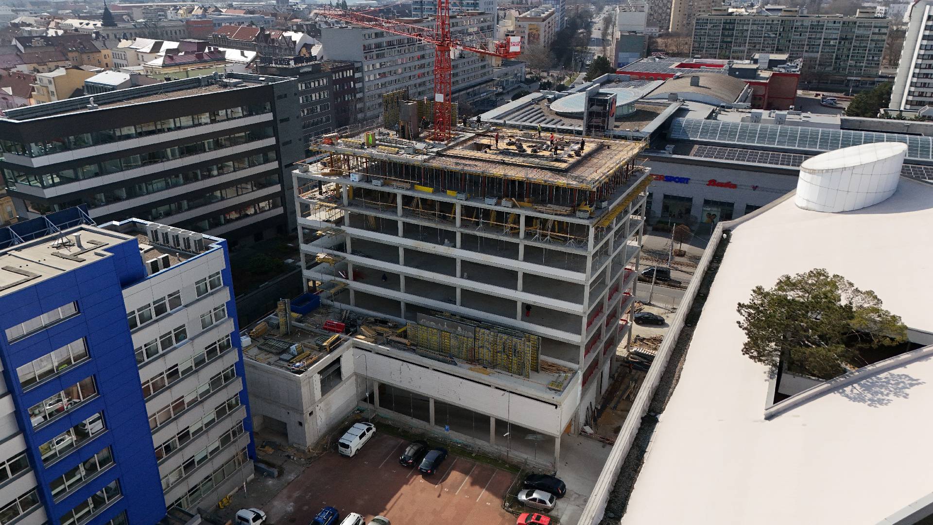 Výstavba projektu pokračuje podle harmonogramu a vstupuje do další významné fáze. Aktuálně dokončujeme monolitickou konstrukci v 9. nadzemním podlaží. Současně probíhají rozvody ZTI a vzduchotechniky v jednotlivých podlažích a dokončuje se retenční jímka.