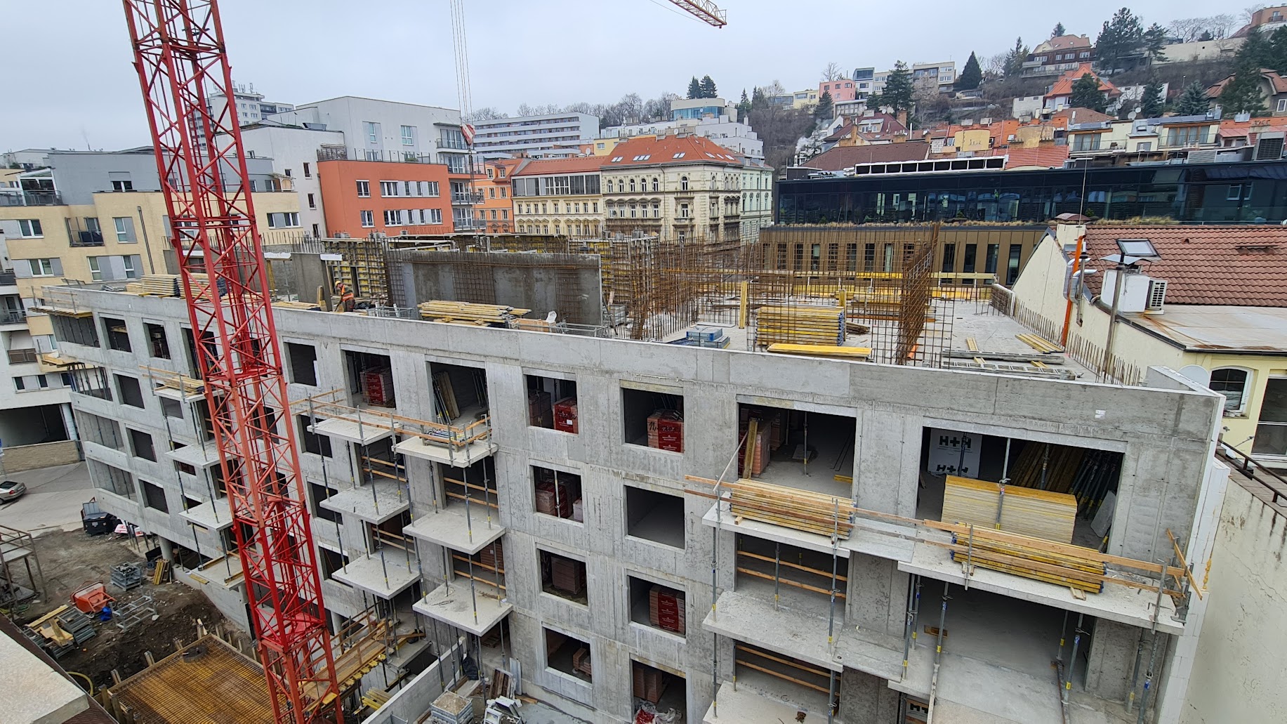 Když se ale podíváte blíže, je znát, že má objekt A přeci jen ještě stále co dohánět. Zatímco tady se teprve betonují poslední stropy, objekt B už má betonování delší dobu za sebou a brzy budou dokonce ve všech patrech osazena i okna!