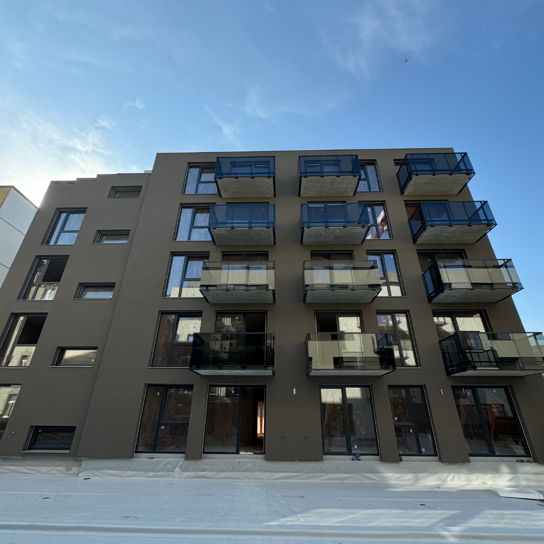 Na obou budovách jsme úspěšně dokončili instalaci balkonových zasklení. V Objektu B probíhá finalizace obkladů schodišť a společných prostor, zatímco v bytech montujeme nábytkové prvky a osvětlení.