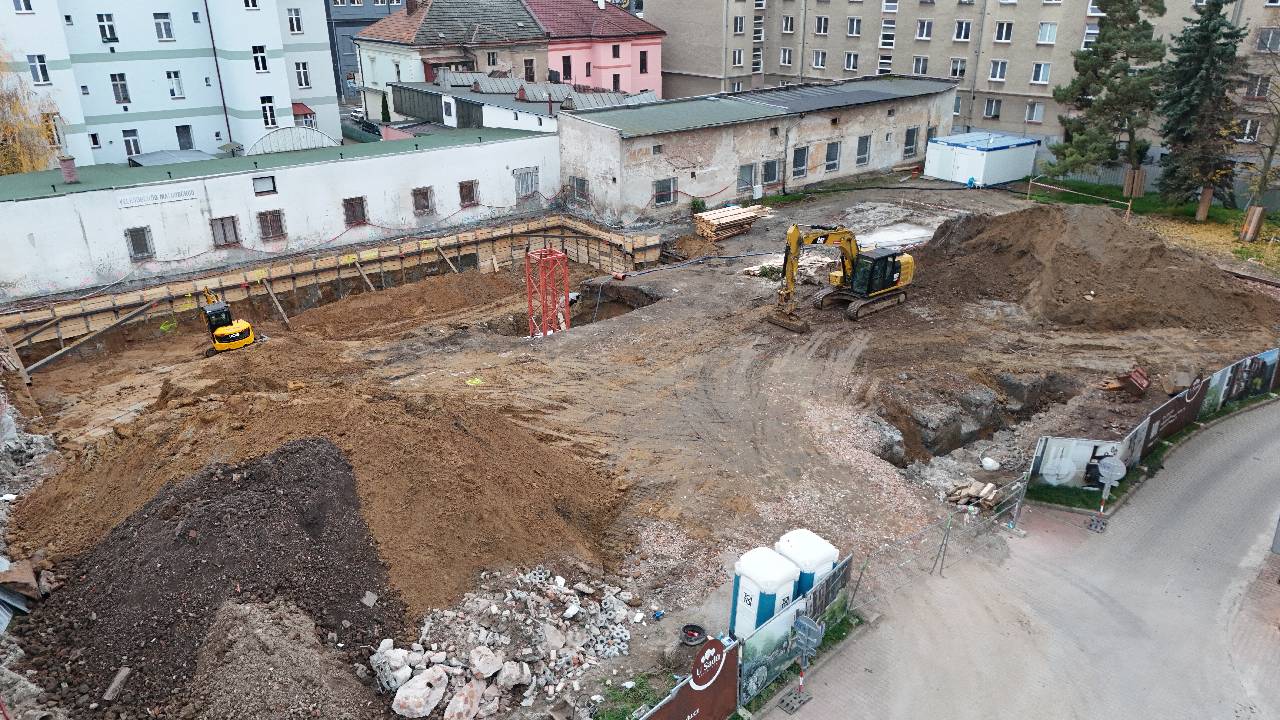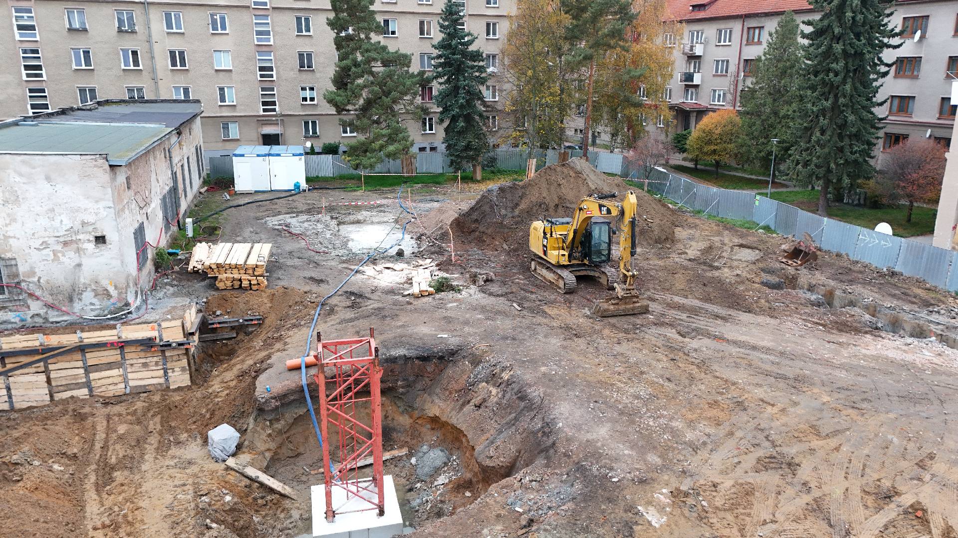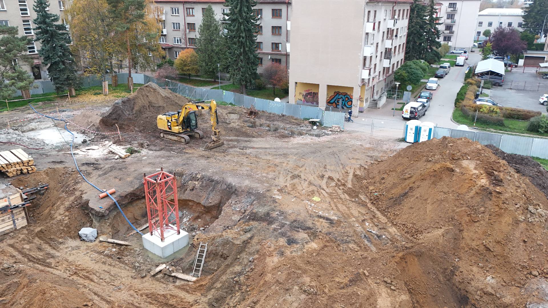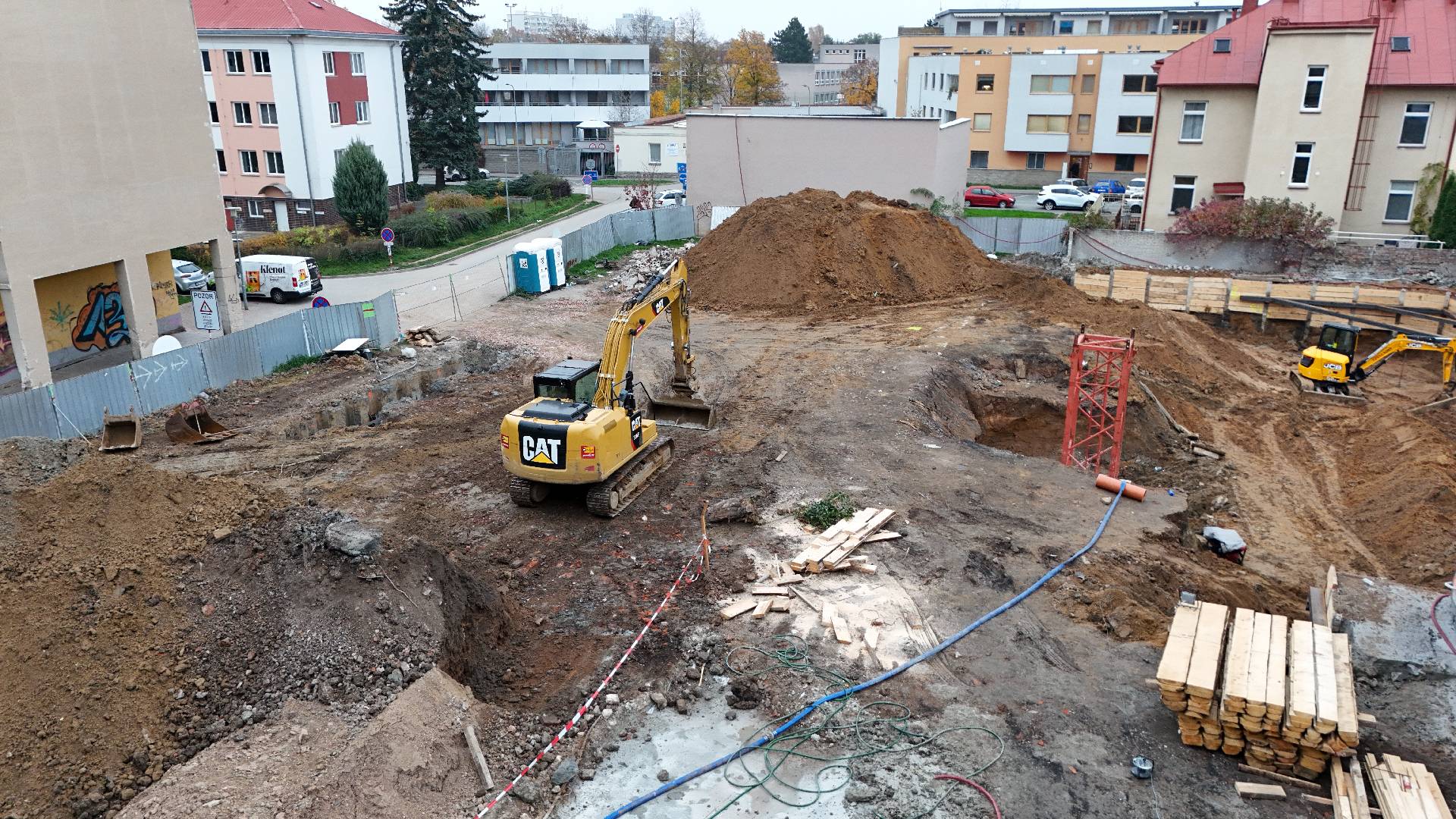 Na staveništi se nyní nachází těžká technika, včetně bagrů a dalšího stavebního vybavení, které zajišťuje plynulý průběh prací a přípravu pro další fáze výstavby.