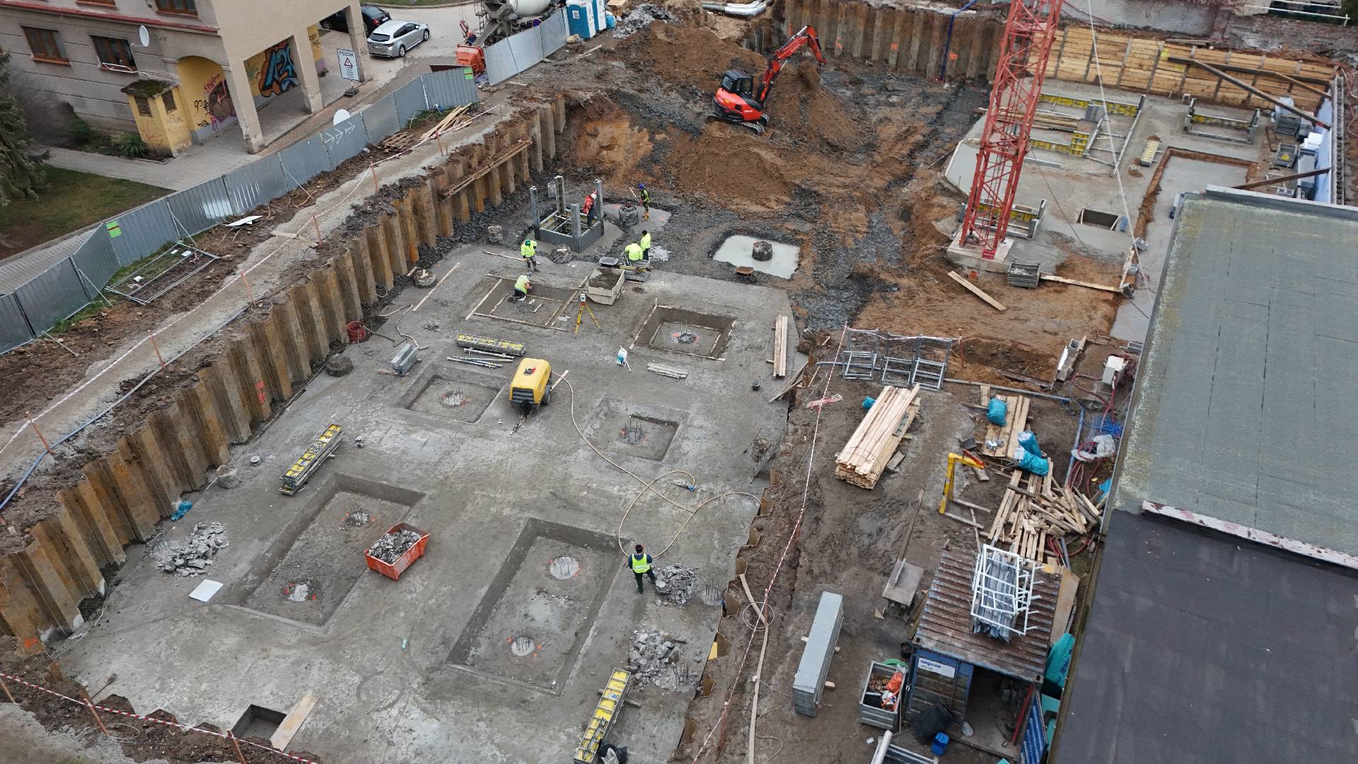 Práce na projektu postupují podle plánu. Aktuálně betonujeme podkladní betony a probíhá bourání pilotů. Zároveň byla úspěšně vyzděna snížená stěna a přibližně třetina výztuže základové desky je již hotova. Samotná betonáž základové desky je naplánována na pátek nebo sobotu.