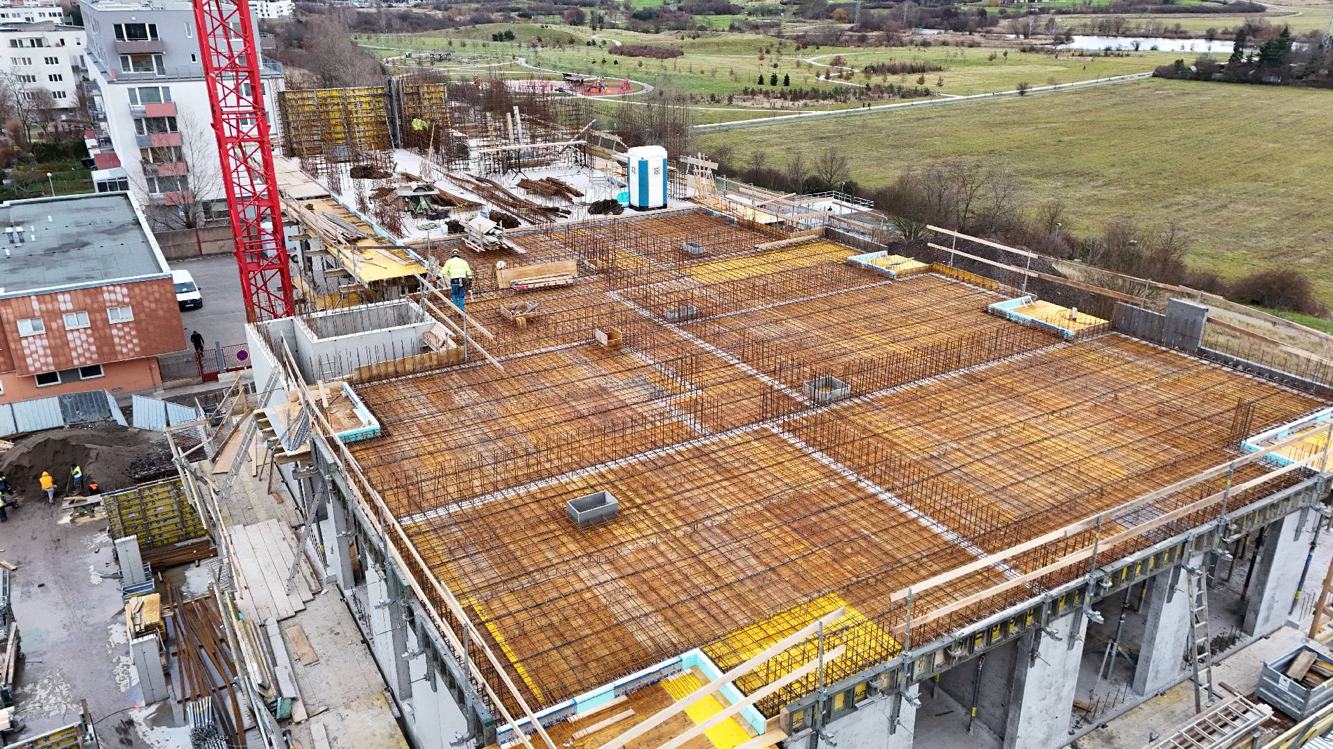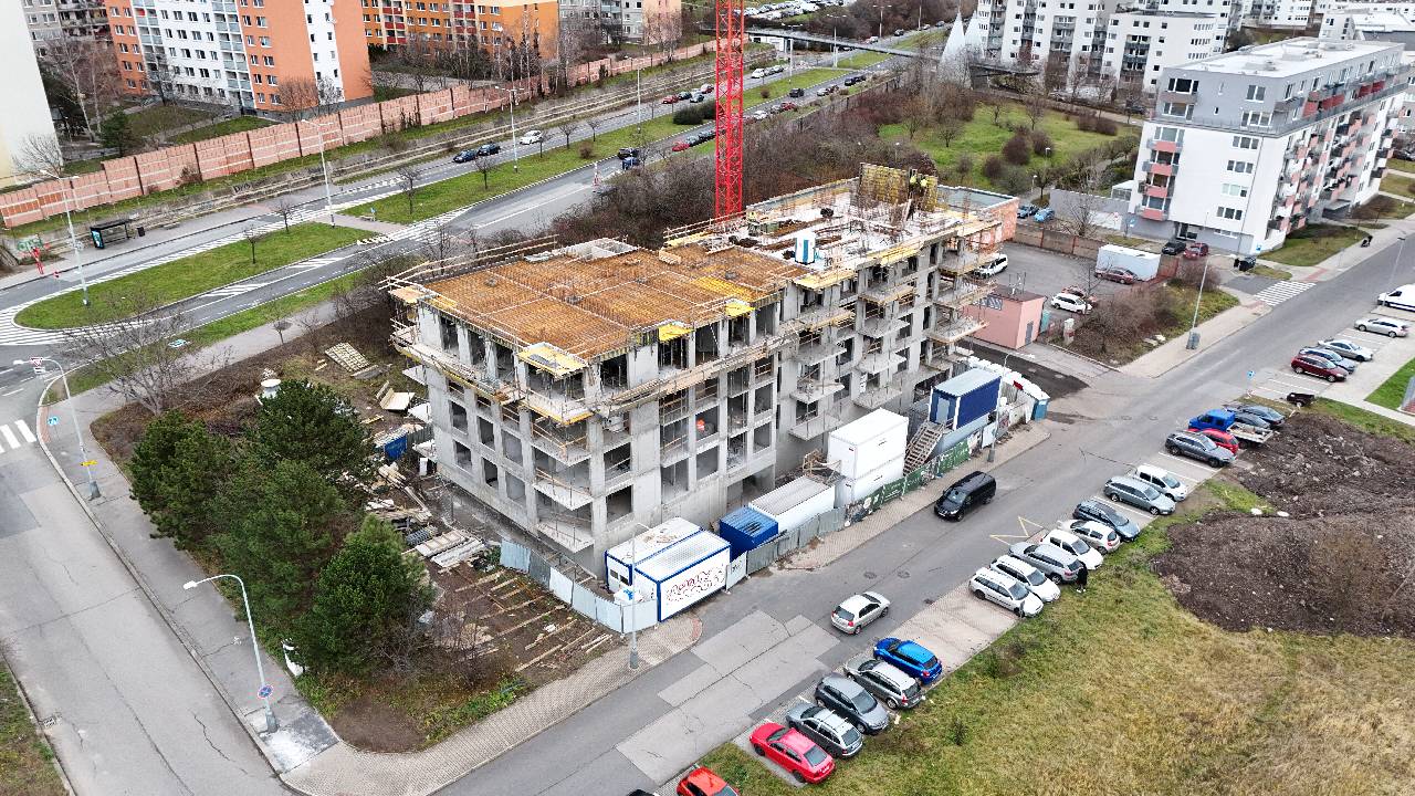 V rámci I. etapy jsme úspěšně dokončili svislé konstrukce stěn a stropů ve 4. NP a nyní postupujeme do 5. NP. Aktuálně probíhá betonáž stropu ve 4.NP. Zároveň pokračuje II. etapa betonáže garáží, kde finalizujeme svislé konstrukce ve 2.PP a sloupy s výztuží v 1.PP.