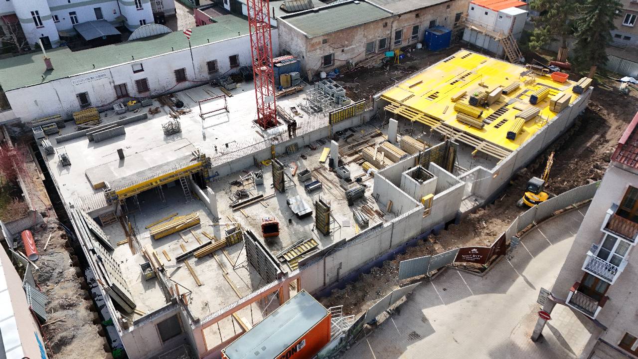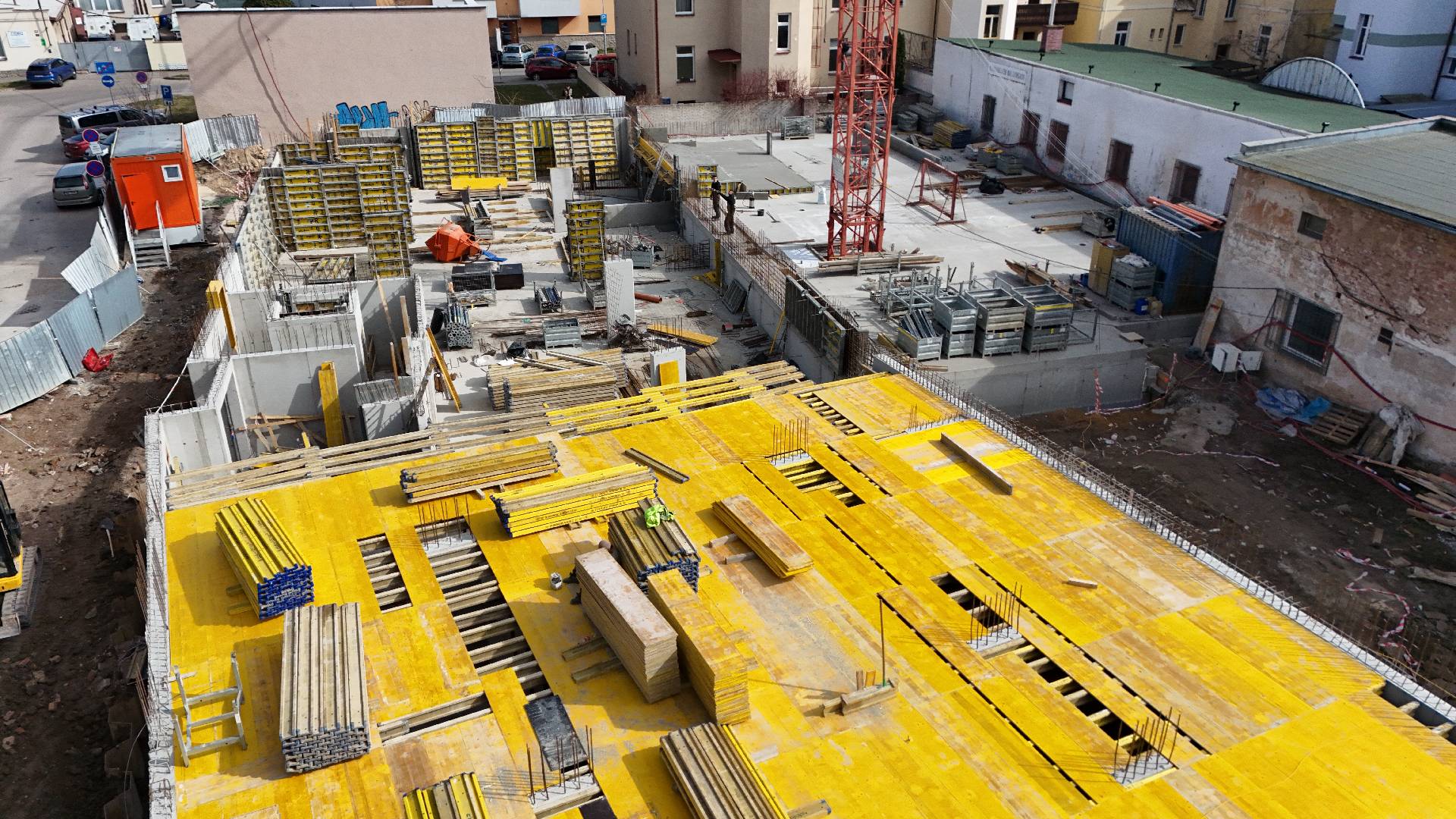 Pokračujeme v klíčových stavebních pracích na Rezidenci U Sadů, konkrétně zasypáváním objektu a betonáží monolitu stropu nad 1. nadzemním podlažím.