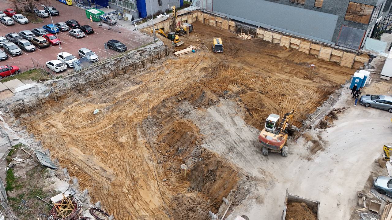 Stavební práce na projektu Epiq Pardubice pokračují dle harmonogramu. Aktuálně probíhá montáž výdřevy, která zajišťuje stabilitu stavební jámy během těžby a odvozu zeminy. Tento proces je klíčový pro bezpečný průběh výstavby a přípravu základů budovy.