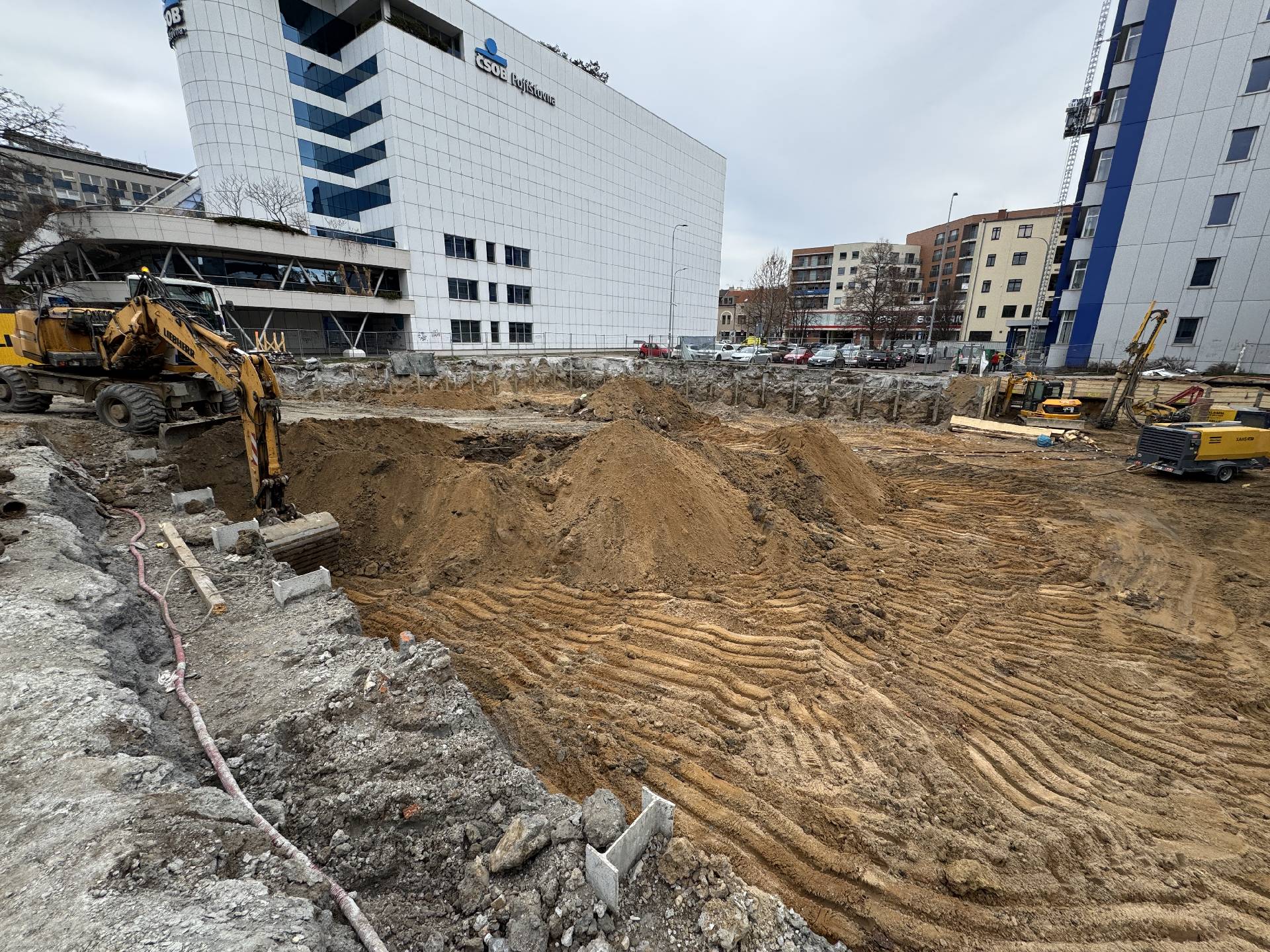 Na stavbě projektu Epiq Pardubice probíhá montáž výdřevy, těžba a odvoz zeminy ze stavební jámy a vrtání s injektáží kotev.
