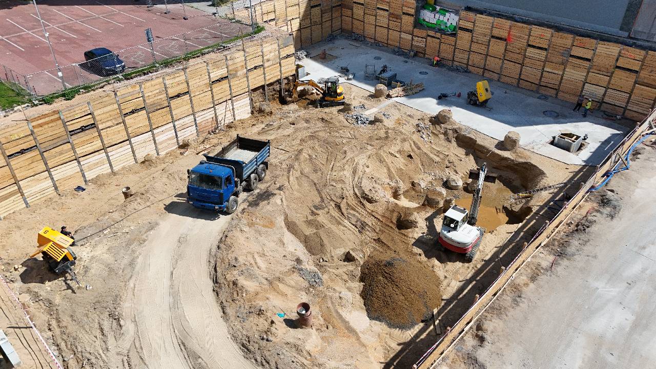 Aktuálně probíhá dohlubování pilotů, které jsou nezbytné pro bezpečné založení budovy. Současně probíhá příprava základové patky pro osazení věžového jeřábu, který bude následně využíván pro manipulaci se stavebními prvky během nadzemní výstavby.