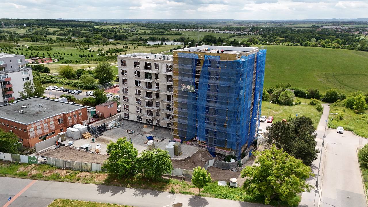Na Garden Living pokračujeme ve vysokém tempu. Dokončujeme technické instalace v posledním podlaží, stříkáme omítky a práce na fasádě se dostávají do další fáze.