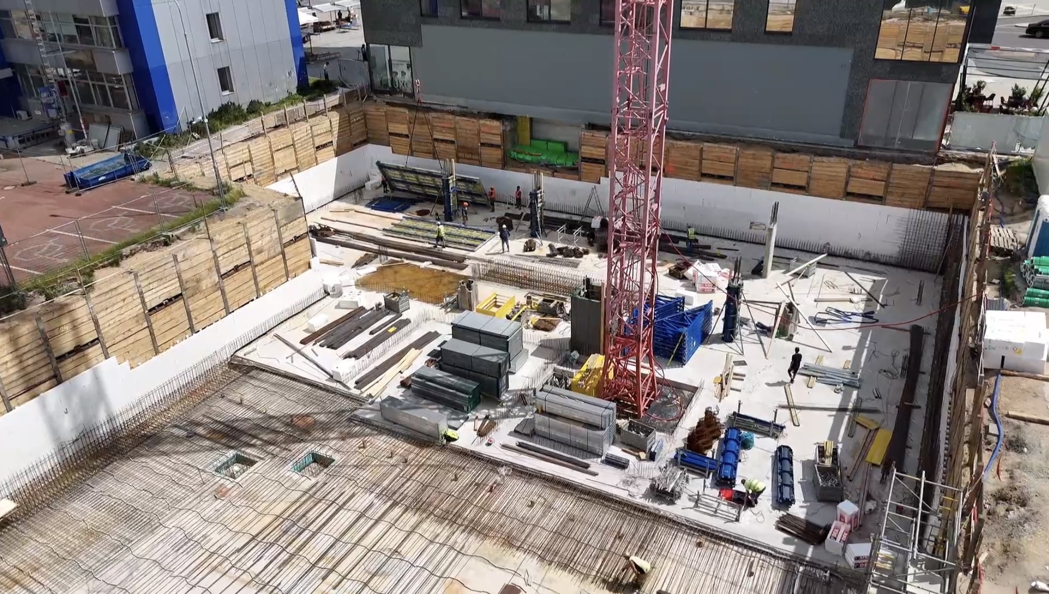 Zároveň probíhá vyrovnávání bednění, které zajišťuje přesnost a stabilitu tvarově složitějších částí konstrukce. Součástí probíhajících prací je také osazování studní, které tvoří základ pro budoucí technické zázemí a vodní hospodářství budovy.